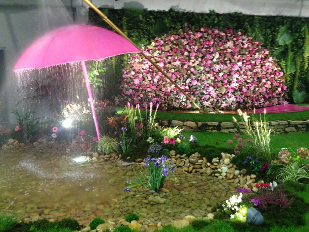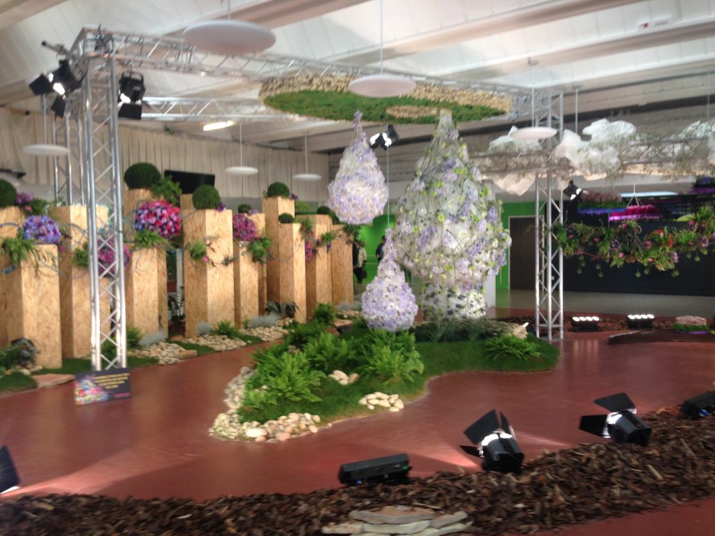 Nous entrons dans le hall d’entrée où Mickaël Rault, champion du monde des fleuristes 2015 a mis en scène de gigantesques gouttes d’eau entourées de colonnes végétales… magnifiques … Cela donne le ton de la visite.